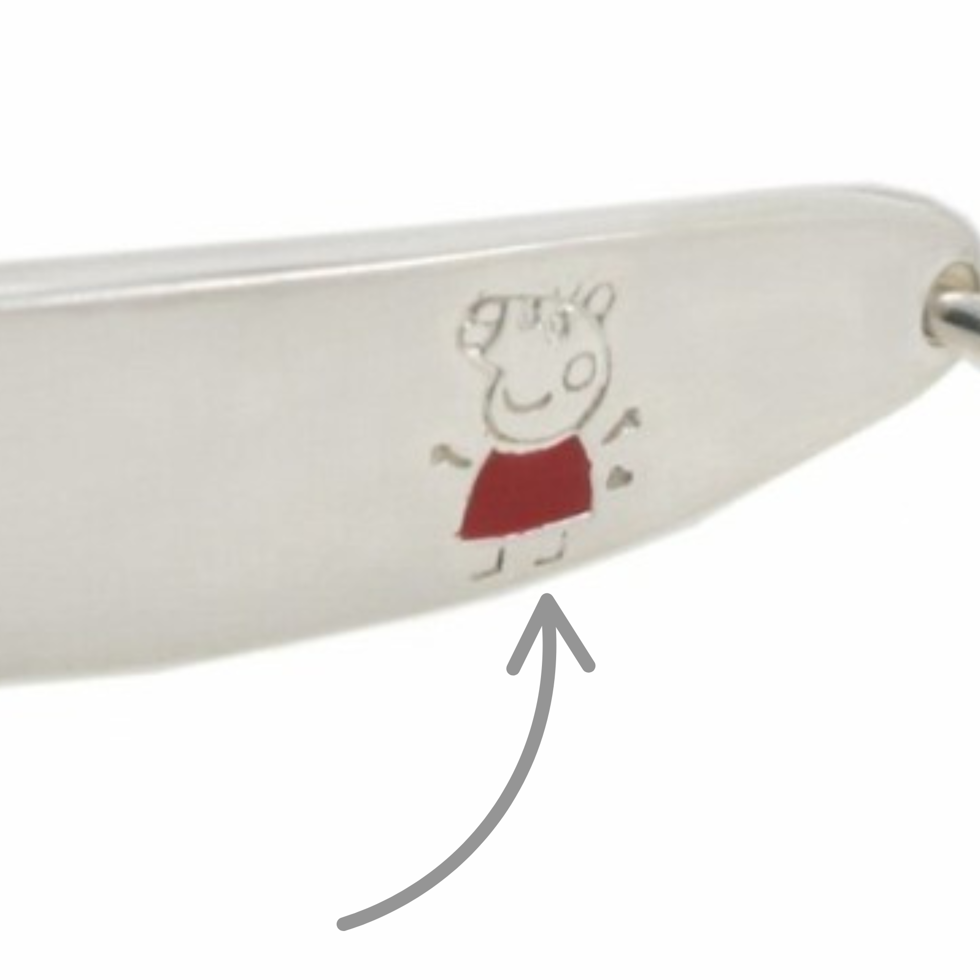 This adorable sterling silver ID bracelet features a charming sketch-style design with a pop of red enamel, adding a playful touch to a timeless piece. The slim ID plate offers ample space for personal engraving, making it a thoughtful gift for birthdays, milestones, or special keepsakes.
